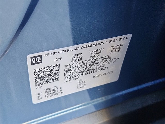 Not all customers qualify for all rebates. See dealer for complete details. Price includes: $500 - GM Military Cash Allowance Program. Exp. 01/04/2027 Recent Arrival! New Price! Equinox LT, 4D Sport Utility, 1.5L DOHC, 8-Speed Automatic, AWD, Lakeshore Blue Metallic, Cloth, 3.47 Final Drive Axle Ratio, 4-Wheel Disc Brakes, 6 Speakers, ABS brakes, Air Conditioning, Alloy wheels, AM/FM radio: SiriusXM, Auto High-beam Headlights, Brake assist, Bumpers: body-color, Cloth Seat Trim, Compass, Delay-off headlights, Driver 6-Way Manual Seat Adjuster, Driver door bin, Driver vanity mirror, Dual front impact airbags, Dual front side impact airbags, Electronic Stability Control, Emergency communication system: OnStar and Chevrolet connected services capable, Four wheel independent suspension, Front anti-roll bar, Front Bucket Seats, Front Center Armrest, Front Fog Lamps, Front Passenger 4-Way Manual Seat Adjuster, Front reading lights, Fully automatic headlights, HD Surround Vision, Heated door mirrors, Heated Driver & Front Passenger Seats, Heated front seats, Heated steering wheel, Illuminated entry, Low tire pressure warning, Navigation System, Occupant sensing airbag, Outside temperature display, Overhead airbag, Overhead console, Panic alarm, Passenger door bin, Passenger vanity mirror, Power door mirrors, Power steering, Power windows, Premium audio system: Chevrolet Infotainment 3, Radio data system, Radio: 11.3 Diagonal Advanced Color LCD Display, Rear anti-roll bar, Rear Camera Mirror Washer, Rear Pedestrian Alert, Rear reading lights, Rear seat center armrest, Rear window defroster, Rear window wiper, Remote keyless entry, Safety & Technology Package, Security system, SiriusXM w/360L Trial Subscription, Speed control, Speed-sensing steering, Split folding rear seat, Spoiler, Steering wheel mounted audio controls, Tachometer, Telescoping steering wheel, Tilt steering wheel, Traction control, Traffic Sign Recognition, Trip computer, Variably intermittent wipers, Wheels: 17 Grazen Metallic Machined-Face Aluminum. 24/29 City/Highway MPG